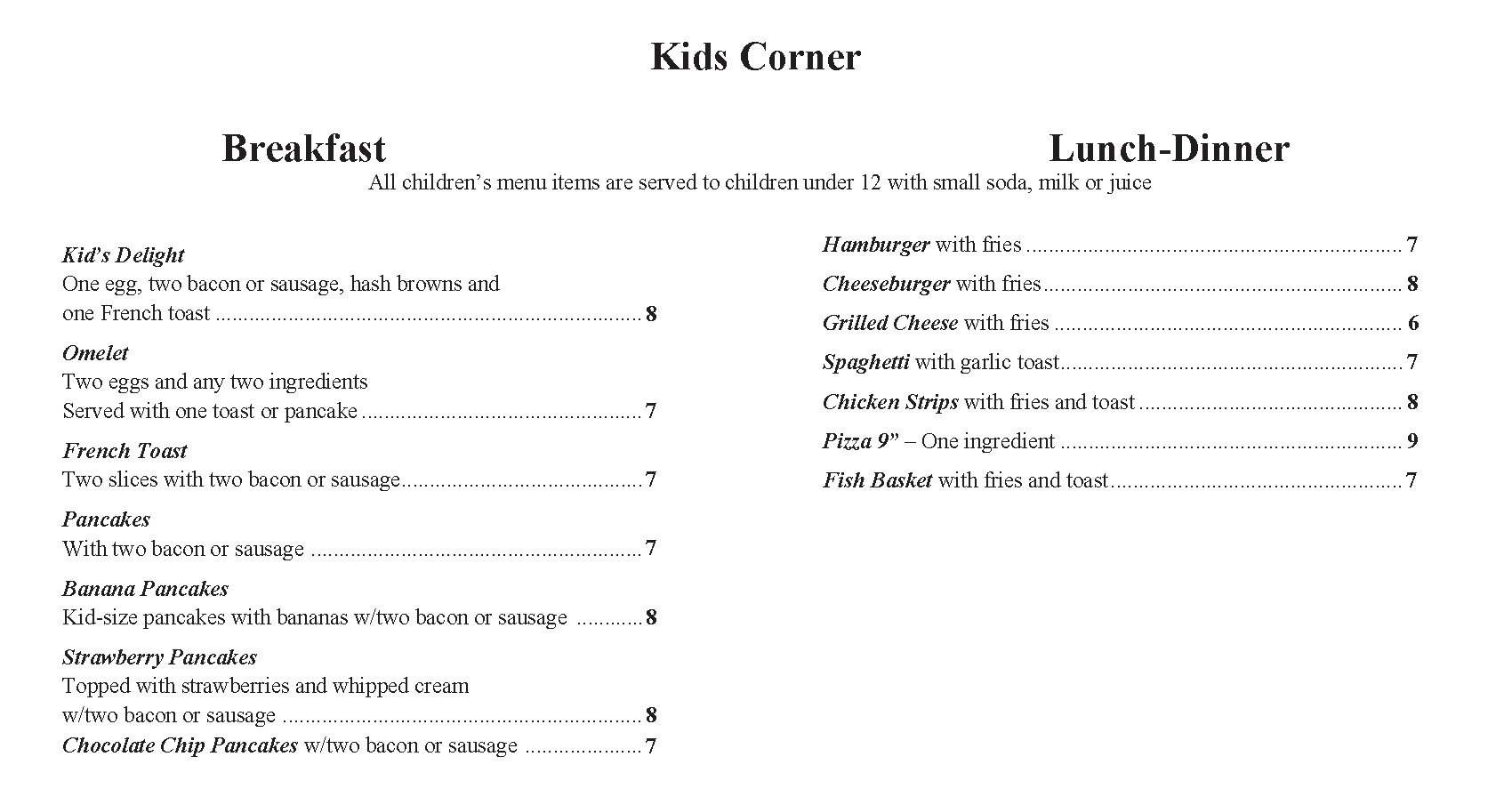 All children’s menu items are served to children under 12 with small pop, milk or juice.